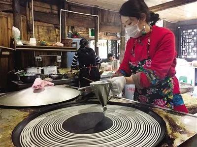 烙:先將大鐵鍋涂上菜油,然后迅速在漏斗里灌滿米漿,以鍋為紙,以漿為墨,從鍋的邊緣開始,均勻的米漿從細(xì)細(xì)的漏斗口流到鍋面上,由外向內(nèi),恰似一個(gè)個(gè)大小不一的同心圓,當(dāng)圓圈畫到鍋的最中心,漏斗里的漿也剛好用盡。