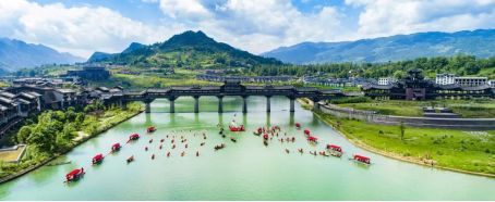 2020年8月23日11點,“世界第一風雨廊橋”——“重慶黔江濯水風雨廊橋”下寬闊而清澈的阿蓬江面上,身穿民族服裝的“阿哥阿妹”俏生生地站在佩戴紅綢和大紅花的喜船上,在艄公的牽引下上演一場別開生面的鵲橋相會,吸引了來自全國各地的游客駐足打卡拍照。