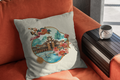 品名:濯水文創▪古濯如畫抱枕售價:68元產品說明:以滿目青山、黛色秀水映襯下的風雨廊橋為背景,手..