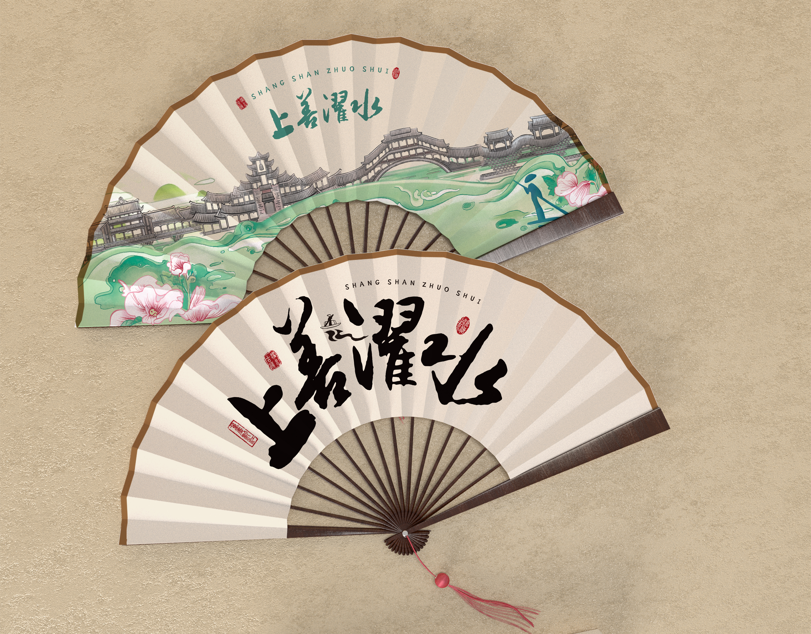 品名:濯水文創▪古濯如畫團扇(兩款)售價:35元產品說明:以岱山秀水間,形如波浪起伏,狀若龍行鳳..