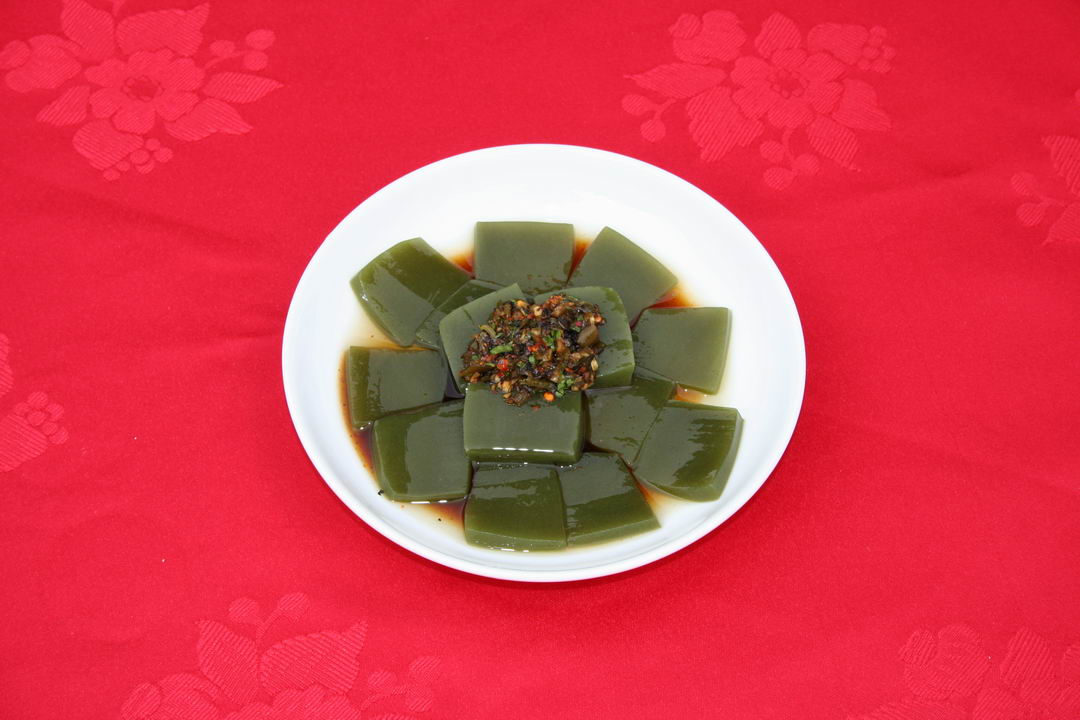 外形四四方方,顏色翠綠非常,口感爽滑Q彈。吃的時候放上辣椒、醬油、醋以及蔥姜末、大蒜水等佐料攪拌一下,然后送入口中,清涼爽滑的感覺定會讓人欲罷不能。