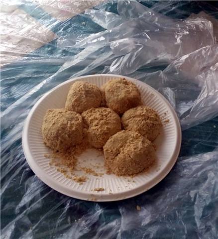 馬打滾為傳統(tǒng)小吃,50年代曾行銷市面,倍受食客青睞。其原料以粘、糯米、黃豆為主,經(jīng)浸泡、舂粉、揉制成湯圓狀 煮熟后滾上混有白糖、芝麻的黃豆粉即可食用,因翻形如馬打滾,故得此名,其味香甜可口,粘糯適宜。