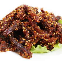 黔江地處武陵山腹地,生態(tài)環(huán)境優(yōu)越,自然草場資源豐富。蓬江牌牛肉干選用武陵山天然草場資源放養(yǎng)的優(yōu)質(zhì)黃牛,經(jīng)嚴格的宰前宰后檢疫,精選其后腿精瘦肉為原料,利用傳統(tǒng)配方,采用傳統(tǒng)工藝和現(xiàn)代科技精制而成,該產(chǎn)品片薄均勻剔透、呈玫瑰色澤、咸甜適宜、酥軟可口、回味悠長、風味獨特,食用方便、綠色、健康。